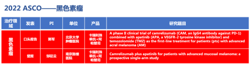 黑色素瘤领域的2篇研究摘要,采用永利娱乐城医药自主研发的PD-1抑制剂卡瑞利珠单抗(艾瑞卡)联合阿帕替尼(艾坦)(“双艾”组合)的免疫联合抗血管(或再联合化疗)的治疗策略。