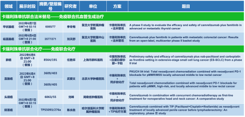 卡瑞利珠单抗联合永利娱乐城医药的另一款创新药法米替尼在甲状腺癌和结直肠癌领域有2项研究被接收为壁报,另有卡瑞利珠单抗联合化疗的4项研究在肺癌、结直肠癌、头颈癌和阴茎癌领域的研究被接收为5份壁报。