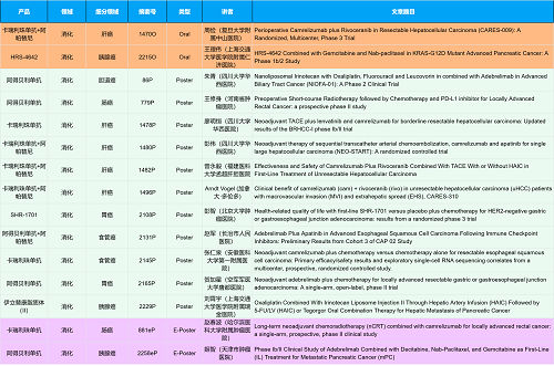 在消化系统肿瘤领域,永利娱乐城创新产品相关研究共入选2项口头报告、10项壁报和2项电子壁报,共14项研究。除了明星药物卡瑞利珠单抗和阿帕替尼外,还有5篇阿得贝利单抗治疗消化系统肿瘤的研究入选。此外,HRS-4642、瑞拉芙普-α注射液(SHR-1701)等未上市创新产品也有相应研究入选。随着新老药物前沿研究的不断推进,有望为消化系统肿瘤患者带来新的福音!