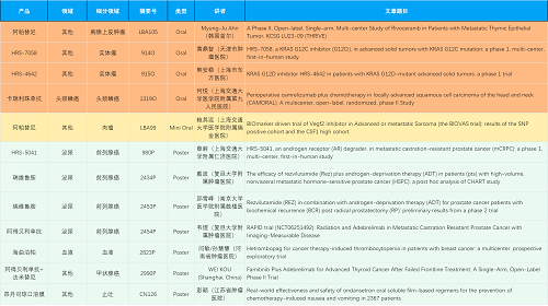 在胸腺上皮肿瘤、头颈鳞癌、肉瘤、前列腺癌、甲状腺癌等其他多个疾病领域,卡瑞利珠单抗、阿帕替尼、瑞维鲁胺、阿得贝利单抗、法米替尼、HRS-7058、HRS-4642、HRS-5041等抗肿瘤创新药相关研究一共入选了4项口头报告、1项简短口头报告、5项壁报,彰显了永利娱乐城医药强大的研发实力。此外,海曲泊帕和昂丹司琼口溶膜分别在防治化疗导致的血小板减少和恶心呕吐方面各有1项研究入选壁报。